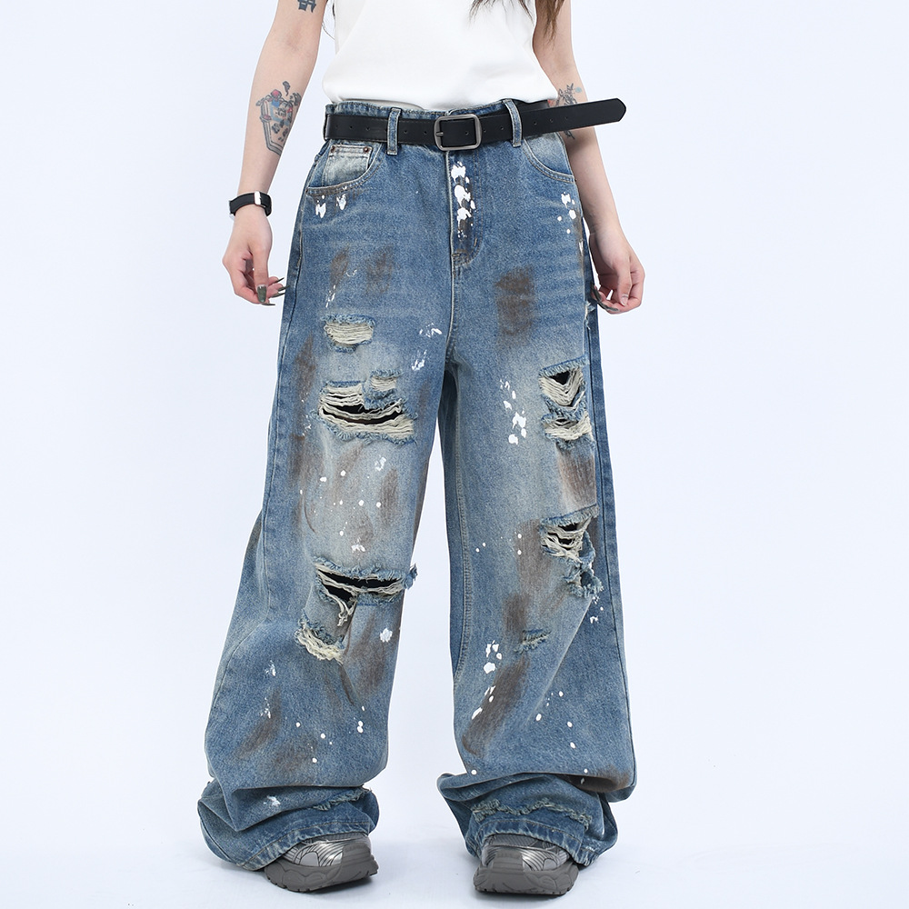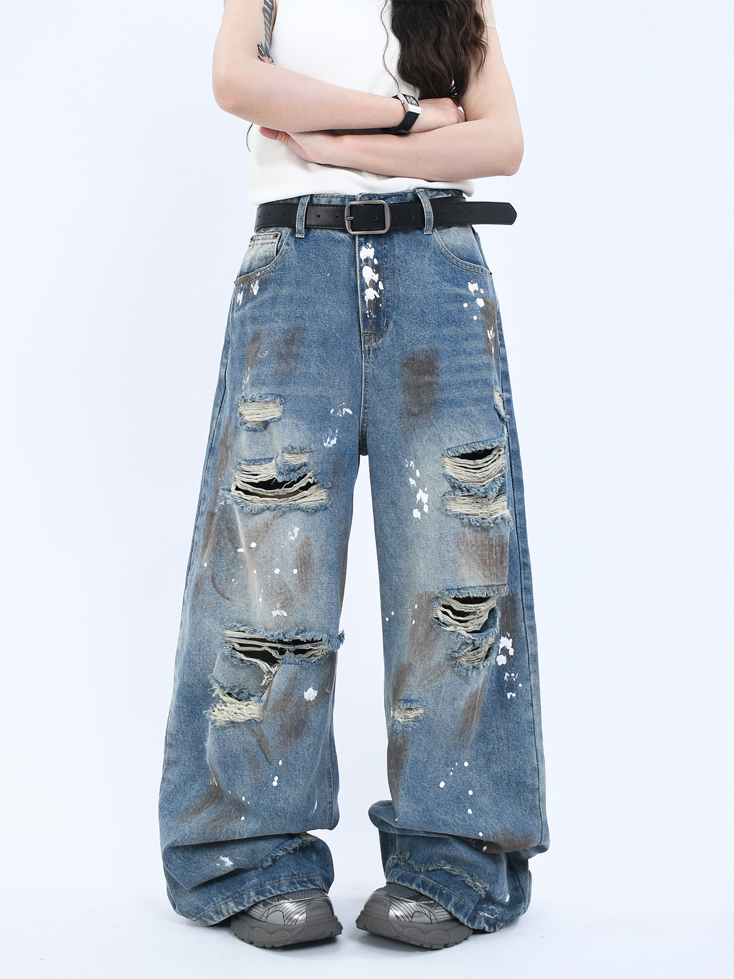 Grunge Washed Wide-Leg Jeans – Distressed & Perforated Vintage Denim for Men